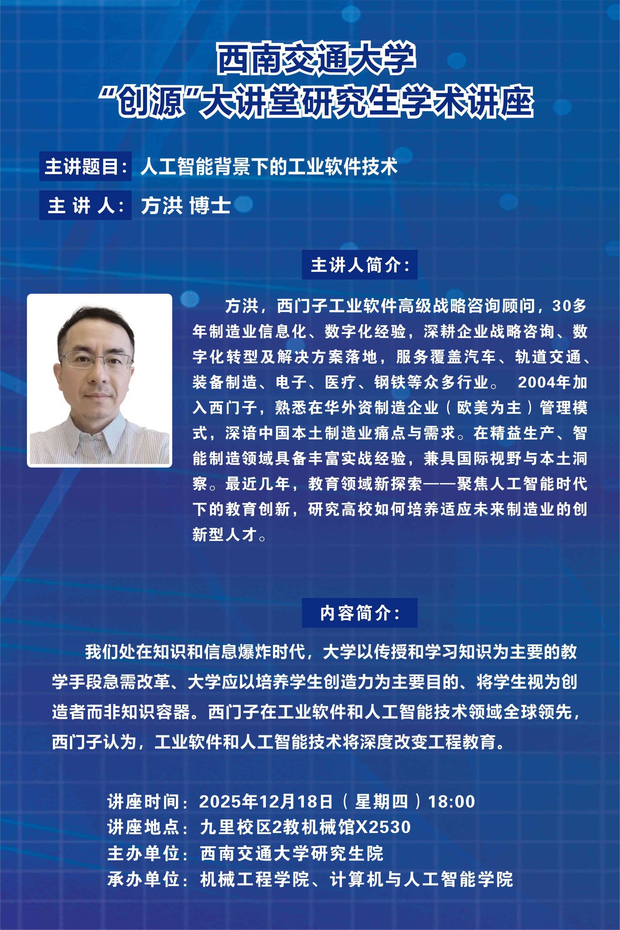 讲座时间:2025年12月18日(星期四)18:00讲座地点:九里校区2教机械馆X2530主讲人:方洪 博士主讲人简介:方洪,西门子工业软件高级战略咨询顾问,拥有30多年制造业信息化、数字化经验,深耕企业战略咨询、数字化转型及解决方案落地,服务覆盖汽车、轨道交通、装备制造、电子、医疗、钢铁等众多行业。2004年加入西门子,熟悉在华外资制造企业(欧美为主)管理模式,深谙中国本土制造业痛点与需求。在精益生产、智能制造领域具备丰富实战经验,兼具国际视野与本土洞察。最近几年,教育领域新...