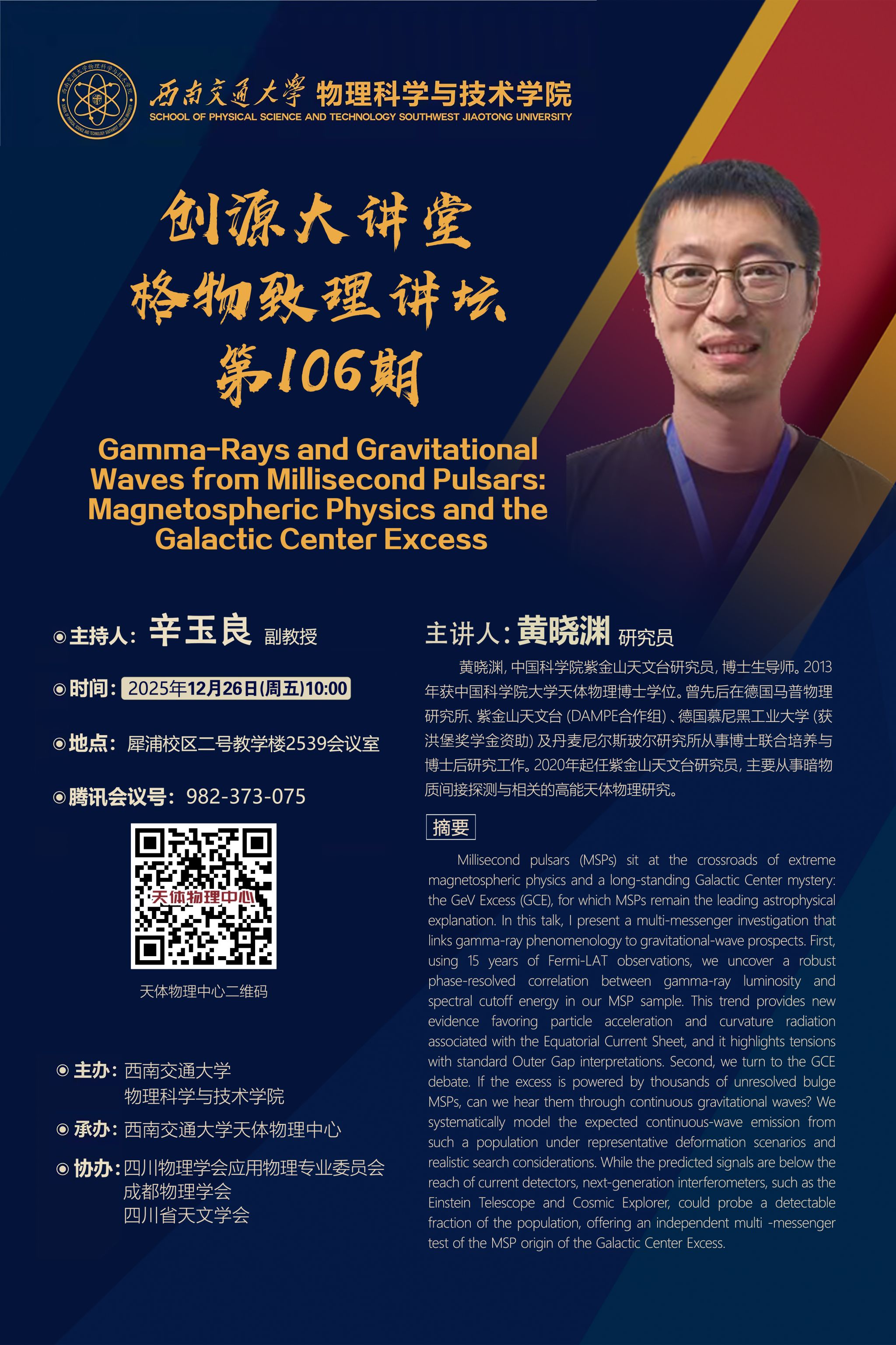 题目:Gamma-Rays and Gravitational Waves from Millisecond Pulsars: Magnetospheric Physics and the Galactic Center Excess主讲人:黄晓渊 中国科学院紫金山天文台研究员时间:2025年12月26日(周五)上午10 :00地点:犀浦校区二号教学楼2539会议室主持人:辛玉良 副教授简历:黄晓渊,中国科学院紫金山天文台研究员,博士生导师。2013年获中国科学院大学天体物理博...