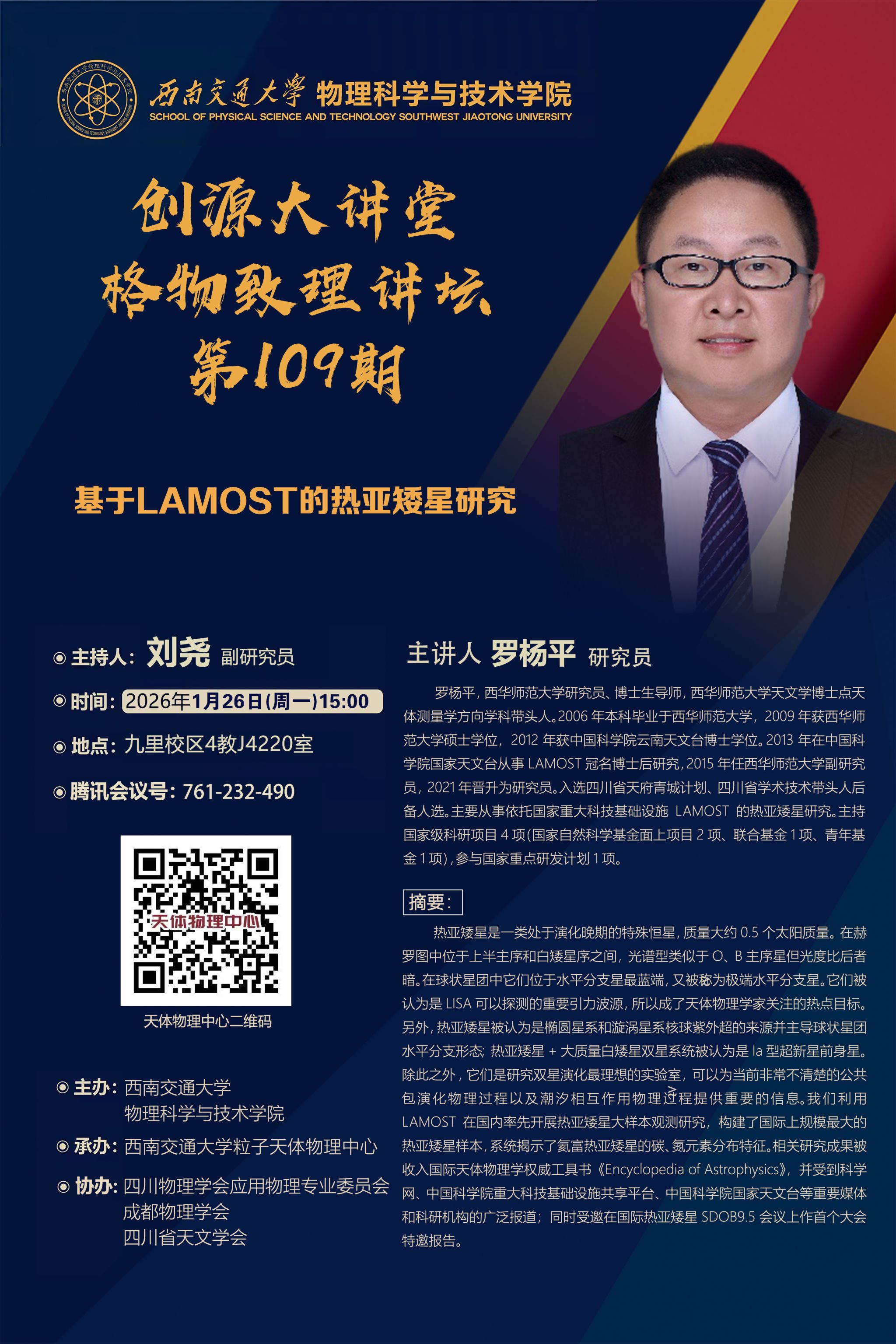 题目:Revealing the Origin of Galactic Cosmic Rays: PeVatrons in the Milky Way主讲人:Felix Aharonian 国际著名粒子天体物理学家时间:2026年1月15日(周四)14:00地点:犀浦校区三教30334报告厅主持人:刘四明 教授简历:Felix Aharonian教授长期担任德国马克斯·普朗克核物理研究所高能天体物理团队负责人及爱尔兰都柏林高等研究院院长。荣获多项国际荣誉,包括2006年欧盟笛卡...